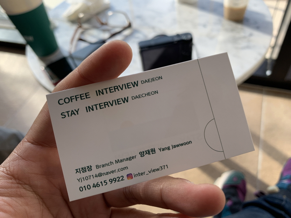 대천 커피 인터뷰의 입구는 어딘가 모르게 해외에 놀러은 느낌을 주고 있다. 건물 뒤로 큰 건물이 있지만 입구 쪽으로는 높은 건물이 없는 절벽에 위치하고 있기 때문에 하늘 아래 커피 인터뷰를 볼 수 있으며 신축 건물로 감각적으로 디자인한 것이 또 하나에 특징이다.