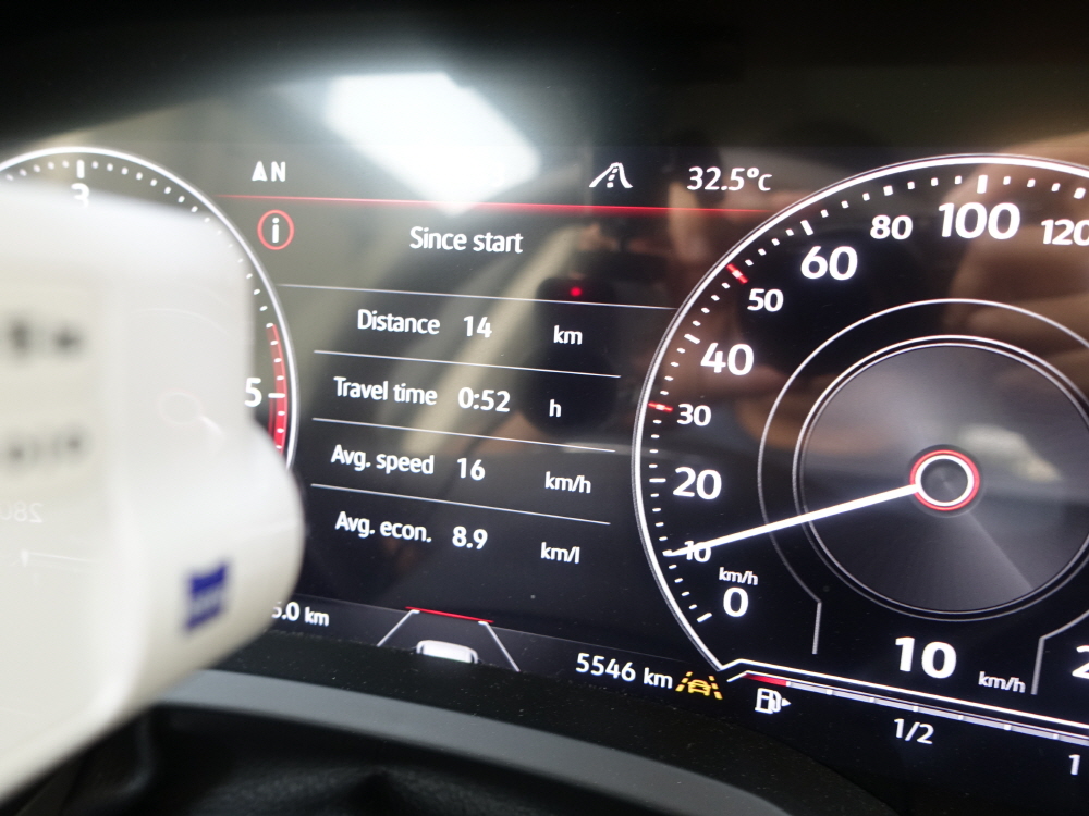 강남 퇴근길 연비는 절대로 좋은 연비가 나올 수 없는 환경이기 때문에 차량 제조사에서 보여주는 공인 연비는 큰 의미가 없다. 투아렉의 공인 복합 연비는 10.3km/L / 공인 시내 연비는 9.5km/L 이지만 총 24.7km/L를 주행하며 2시간 30분이라는 엄청난 시간이 걸리면서 보여준 연비는 7.3km/L로 공인 시내 연비보다는 2.2km/L 낮지만 그래도 2.2톤이 넘는 무게에 3.0 디젤 엔진에서 이정도 연비는 나쁘지 않은 연비를 보여줬다.