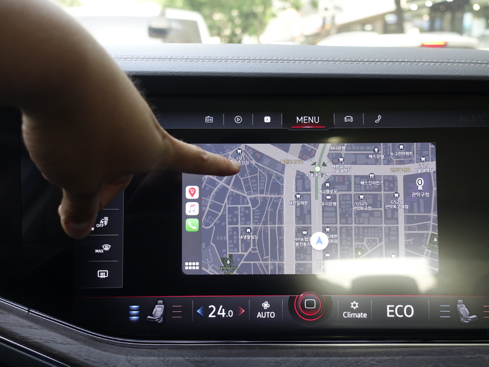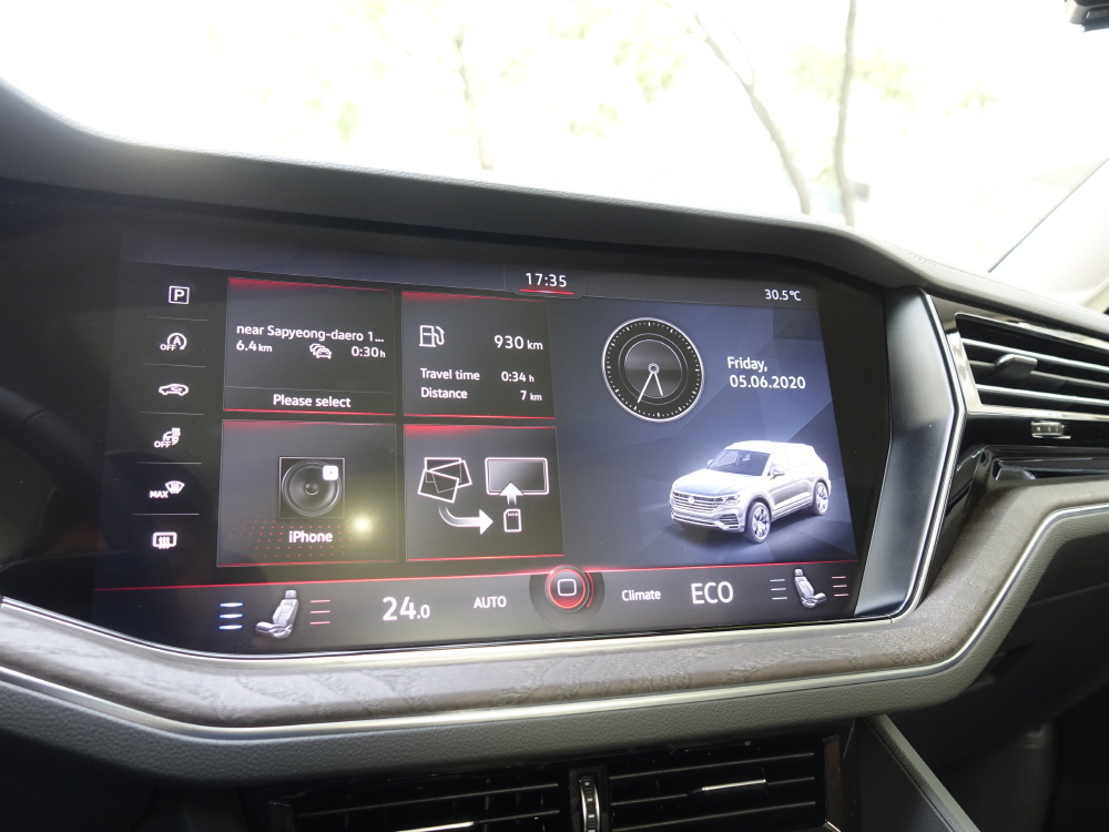 투아렉의 실내에 특징은 많지만 그래도 딱 하나만 선택하라면 바로 15인치 인포테인먼트 시스템이다. 기존 테슬라에서 세로형 17인치 인포테인먼트 시스템이 적용되고 있지만 내연기관 차량에서 15인치 그것도 가로형으로 들어가는 경우는 처음이다. 투아렉에 적용된 인포테인먼트 시스템은 굉장히 단순하면서 최대한 운전자가 편리하게 사용할 수 있게 설계 되어 있으며 손가락을 터치하기 전에 이미 인포테인먼트 시스템은 동작을 감지하는 시스템이 적용되어 있다. 다만 애플 카플레이를 사용할 경우 화면이 가득차지 않는 부분은 살짝 아쉽다.