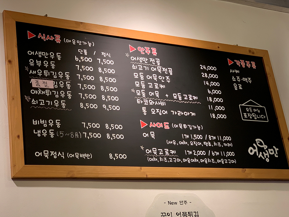 선정릉역 맛집인 어생만은 단품 식사가 6,500 ~ 7,500원 선이며 혼자 식사하기도 좋은 곳이기 때문에 이 근처 직장인들이 많이 찾는 곳이다. 특히나 이 곳의 안주류 또한 가격이 괜찮은 편으로 비오는 날 오뎅이 땡기는 날에는 줄 서서 먹어야할 정도로 숨겨진 맛집 중 하나이며 모든 메뉴는 포장이 가능하기 때문에 이 근처 살면 포장도 좋은 방법이다.