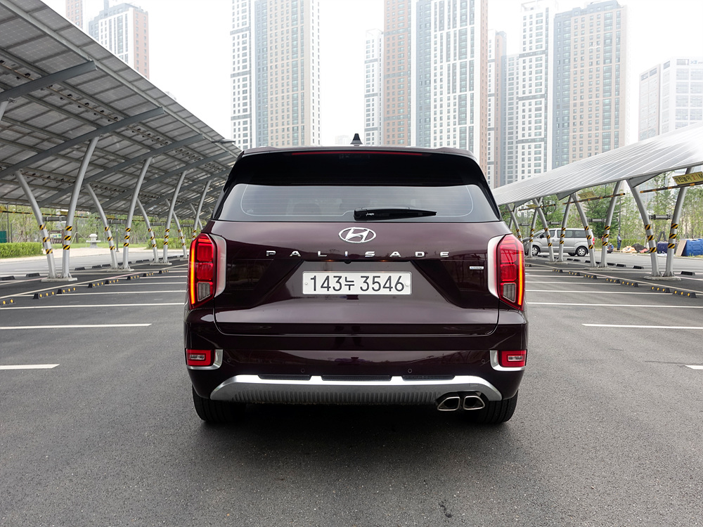 팰리세이드 캘리그라피와 하위 트림을 비교하면 전면 범퍼 하단과 후면 범퍼 하단이 다르다는 것을 볼 수가 있다. 바로 캘리그라피 전용 스키드 플레이트가 적용되었는데 차량 디자인이 좀 더 넓어 보이는 효과를 보여주고 있다는 점에서 디자인 완성도가 조금은 더 올라간 느낌을 보여준다.