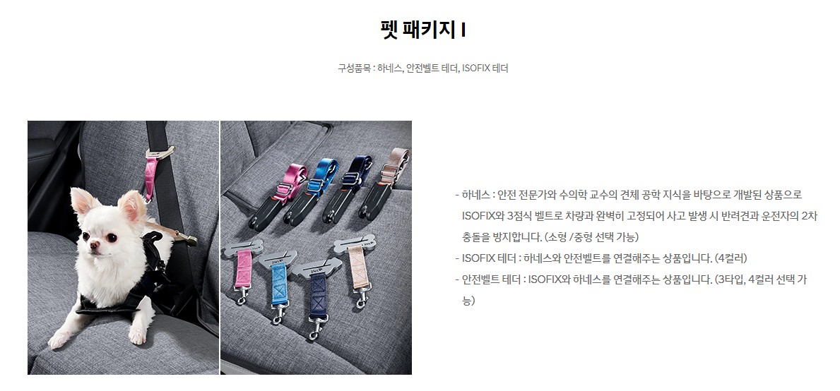 강아지를 키우고 차량에 태우고 다니는 사람이라면 펫 패키지를 구입하면 어떨까? 헤네스와 안전벨트 테더 그리고 ISOFIX 테더를 세트로 구성하여 총 13만 원에 판매를 한다. 하네스는 안전 전문가와 수의학 교수의 강아지에 맞는 제품 개발된 상품으로 사고 발생 시 반려견과 운전자의 2차 충돌을 방지할 수 있다.