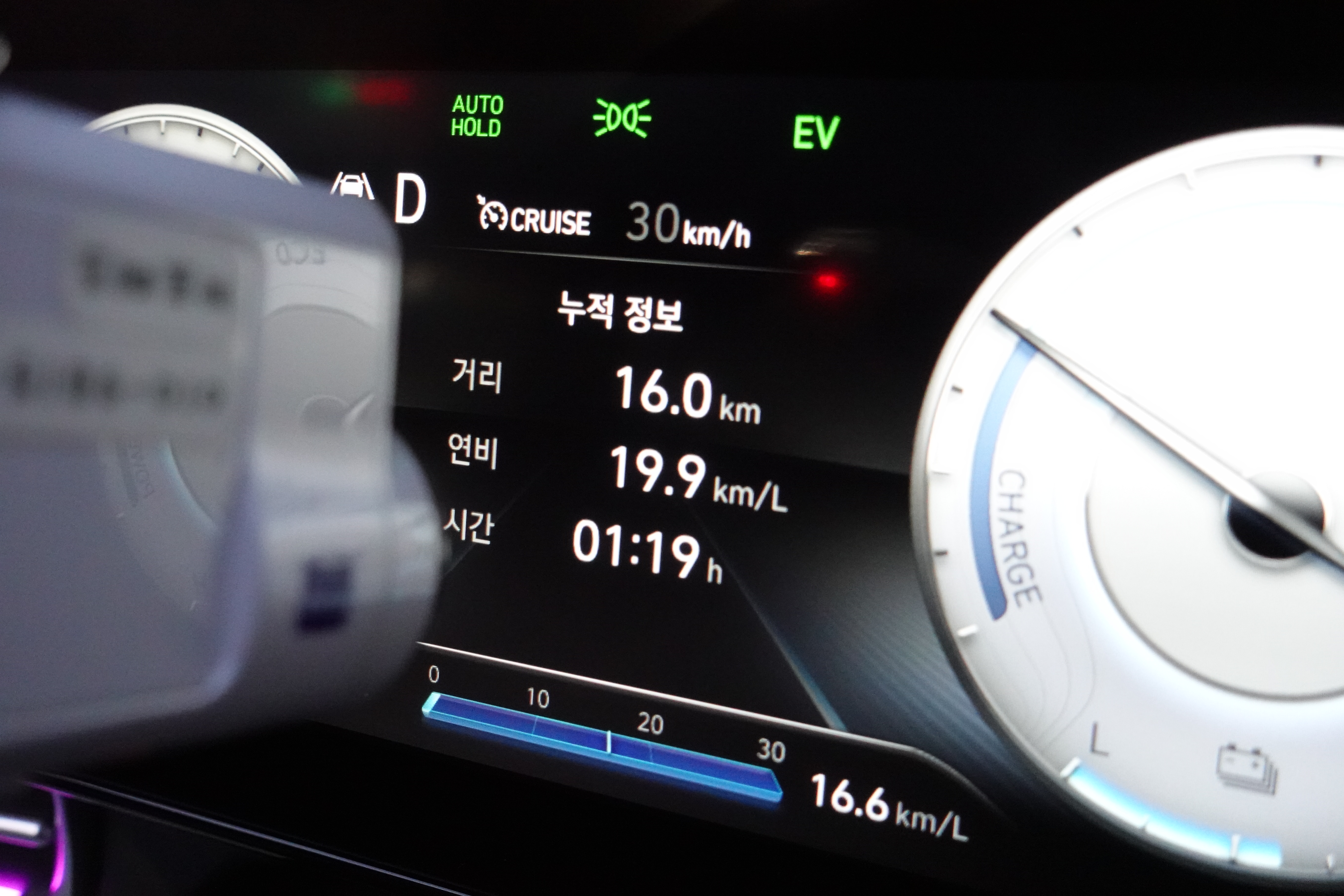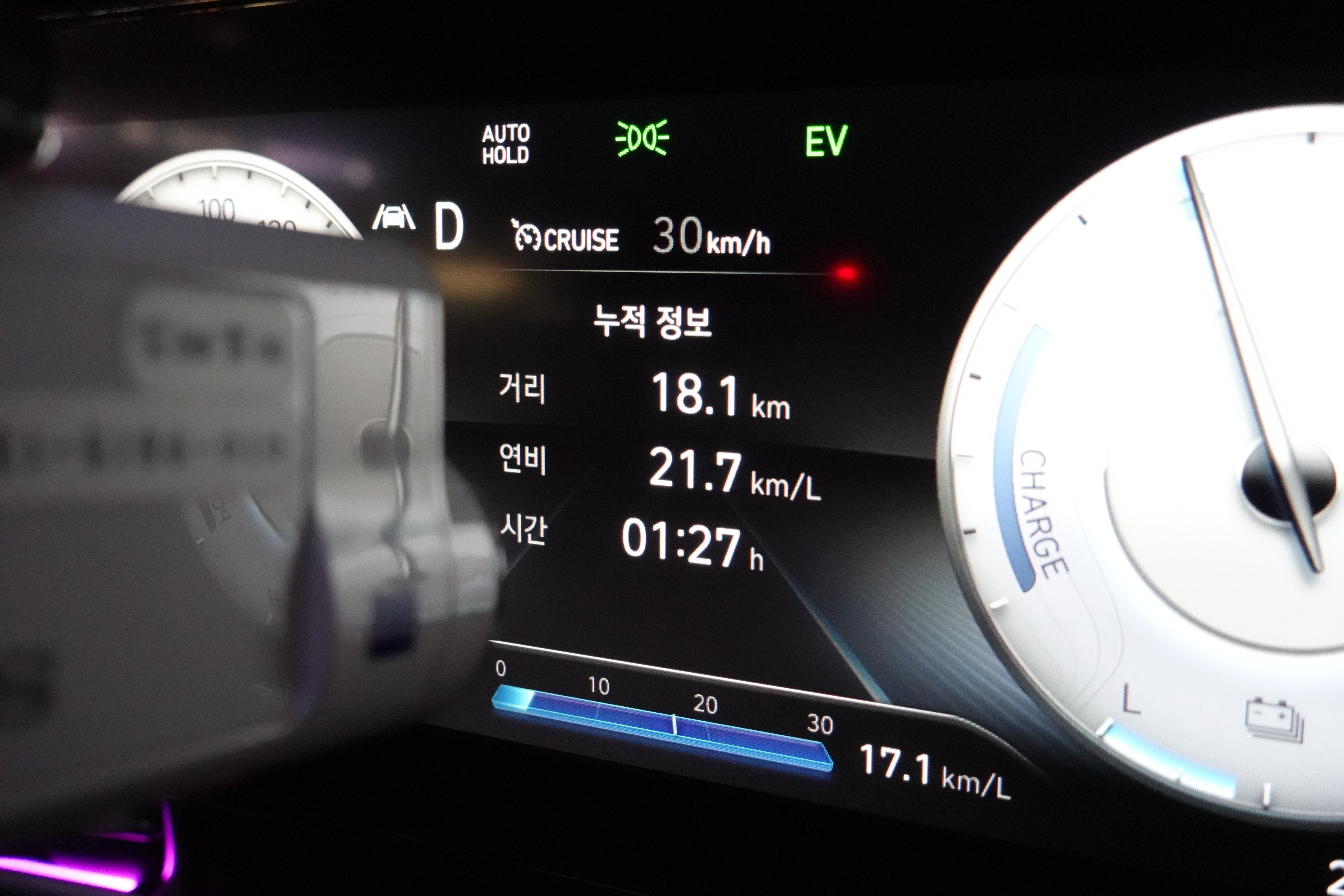 서울에서 단양으로 이동하고 1박을 한 후 차량에 펑크로 인하여 빠른 고속주행은 어려웠다. 따라서 시속 80~90km/h로 어댑티브 크루즈 컨트롤을 사용하면서 타 차량에 피해를 주지 않으면서 달려본 결과는 31.3km/L라는 높은 연비를 확인할 수 있었다. 쏘나타 하이브리드 모델에는 솔라 루프와 ASC (Active Shift Control)이라는 변속 기술이 적용되어 고속주행에서 상당히 높은 연비를 보여줬는데 아반떼 하이브리드 모델 또한 상당히 좋은 연비를 보여주고 있었다.