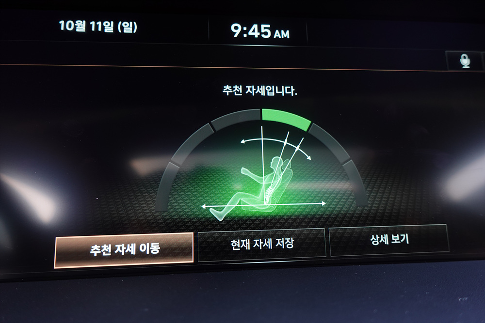 제네시스 G90 모델에 적용된 추천 자세 기능은 운전자의 신체조건을 입력하면 운전에 가장 좋은 추천 자세로 이동한다. 물론 운전 성향에 따라서 자세가 불편하게 느낄 수가 있지만 장시간 운전을 하고 내려오고 난 뒤 찾은 기능으로 장 시간 운전 후 허리가 아팠던 사람들이라면 내가 맞는 자세로 운전하는지를 자동차에게 물어볼 수 있는 기능이다.