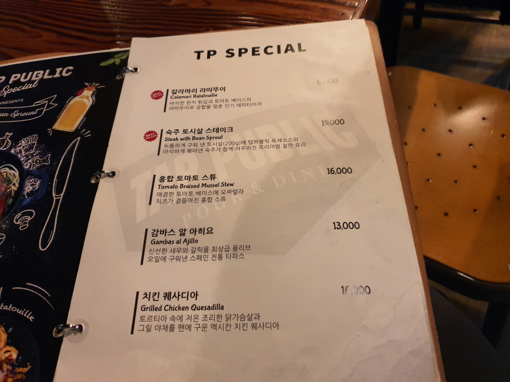 탭 퍼블릭은 그 비싸다는 여의도 한복판에 위치하고 있지만 가격은 생각보다 저렴한 편이다. 스테이크 리조또에 피자 1판에 35,000원의 구성을 가지고 있는 세트메뉴부터 1만 원 이하의 메뉴도 종종 보이고 있으며 무엇보다 배가 부르면 굳이 안주를 시키지 않고 맥주만 마시더라도 절대 눈치 볼일이 없다는 점이 가장 매력적인 부분이다.