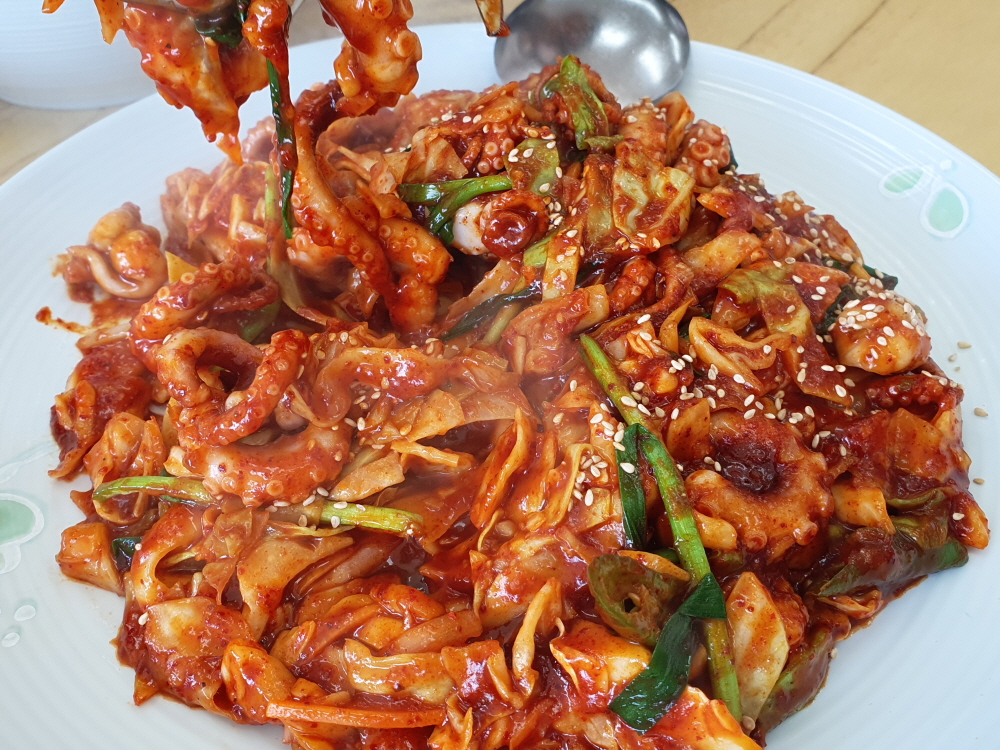 기본 반찬으로 주는 콩나물과 낚지볶음을 어느정도 넣어서 잘 비벼서 먹으면 매콤한 맛을 느낄 수 있는데 오랜만에 기분 좋아지는 낙지를 맛볼 수가 있다. 콩나물이 싫은 사람이라도 낙지만 넣고 비벼서 먹어도 꽤 맛있고 한 번에 다 비벼서 먹기 보다는 나누어서 비벼서 먹는 것을 추천한다. 약간 맵다고 느껴질때 콩나물을 살짝 넣고 미역 냉국과 함께 먹으면 그 조화가 좋다.